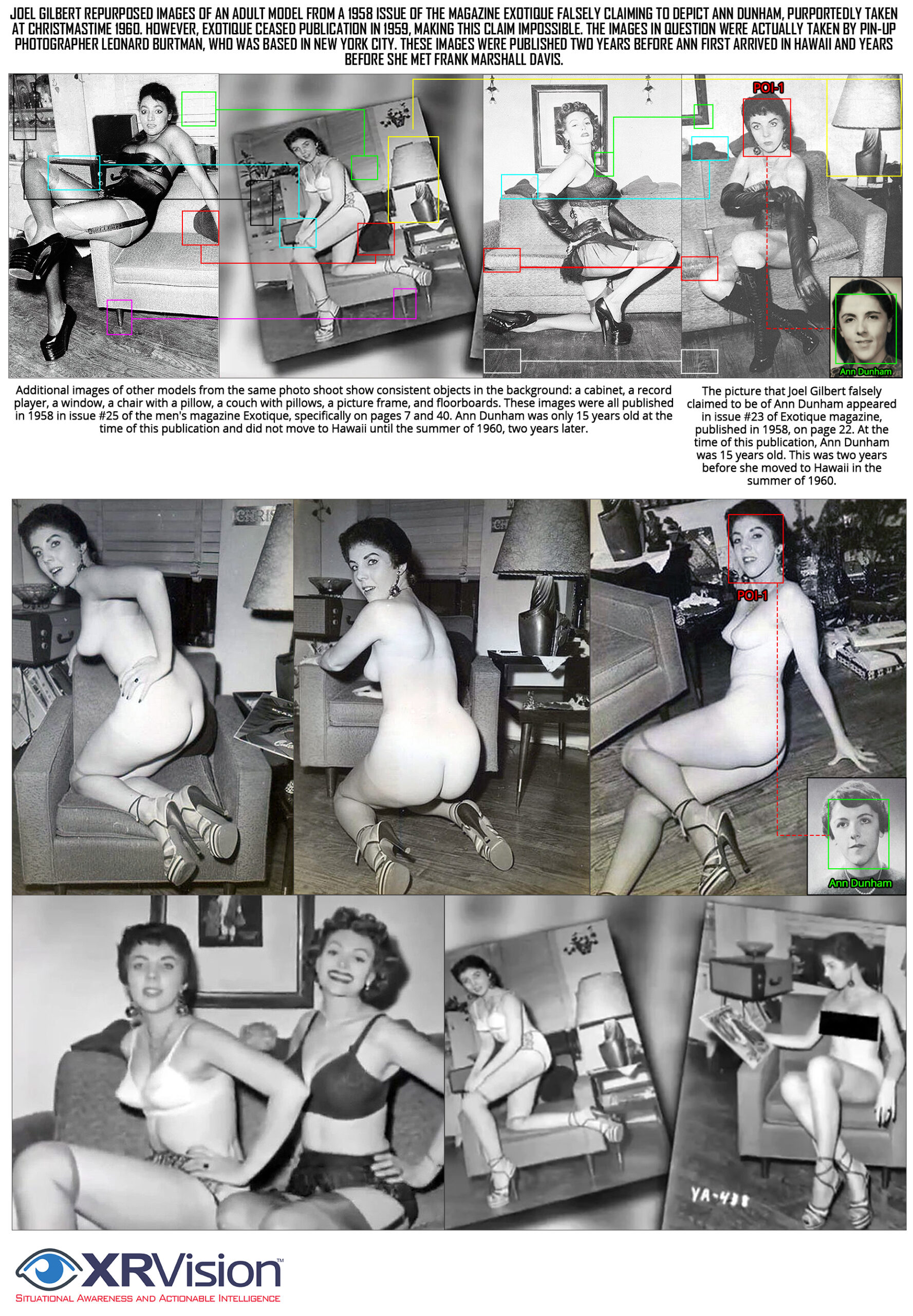 Image 1: Comparison of the images Joel Gilbert attributed to Ann Dunham with original photographs published in Exotique magazine. The composite shows that the images came from a 1958 Leonard Burtman pin-up shoot published before Dunham arrived in Hawaii, with recurring background objects across the series confirming a common commercial studio setting. Facial comparison further shows that Ann Dunham and the model in the photoshoot do not match in key facial features and overall structure, contradicting Gilbert’s claim that the images depict Dunham.